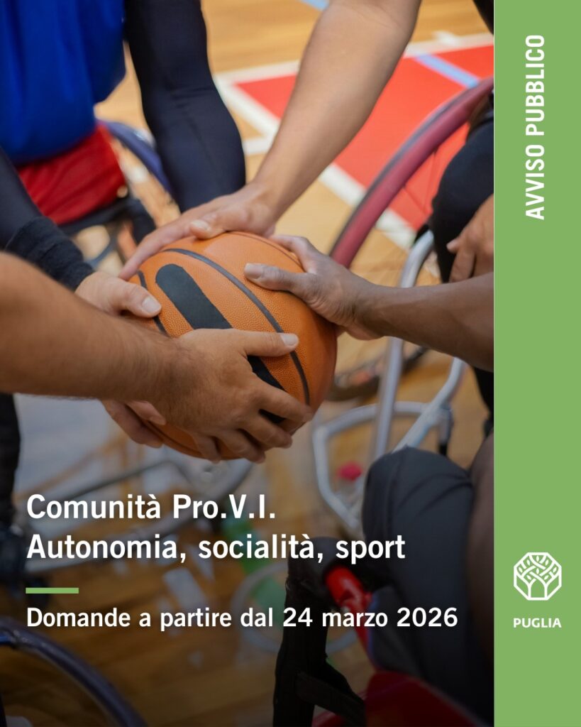 Regione Puglia con Determinazione dirigenziale n. 192/334 del 9.03.2026 ha approvato il nuovo Avviso pubblico “Comunità Pro.V.I. –Autonomia, socialità, sport” operativo dalle ore 12.00 del 24.03.2026 alle ore 12.00 del 24.06.2026.